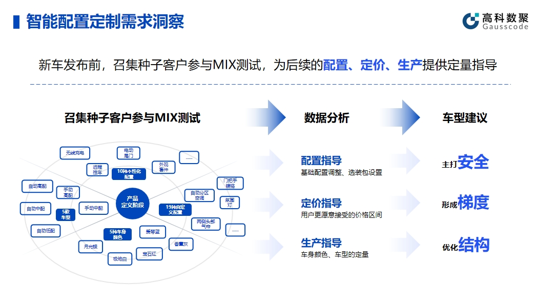 智能配置的有效应用可以帮助企业提升产品和服务的智能化水平。在实际应用中,金年会诚信至上帮助车企在新车发布前召集种子客户参与MIX测试,顺利获得收集种子客户的反馈和数据,车企能够精细调整产品配置,为后续的配置、定价、生产给予定量指导。同时,这种方法不仅有助于提高产品质量,还能提前发现潜在问题并及时解决。