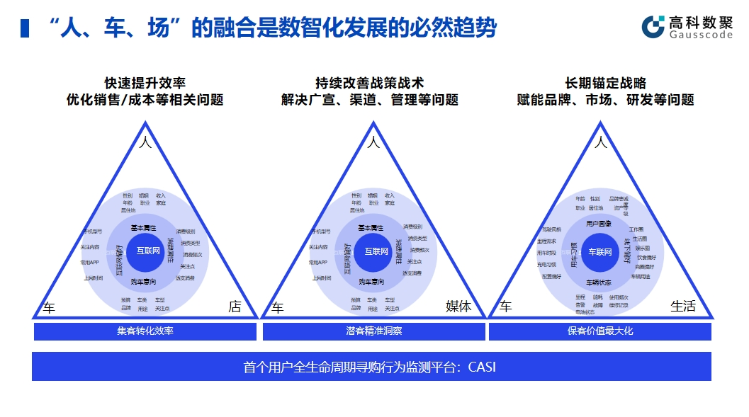 面对汽车行业的数智化,程杰博士认为,'人、车、场'的融合是汽车行业数智化开展的必然趋势,特别是车联网高速开展今天,全方位、全时空地洞悉车主人群在汽车、地产、旅游、金融、零售、医美、商业等不同行业领域的客户行为及体验洞察,将为各行业带来巨大的商业价值。