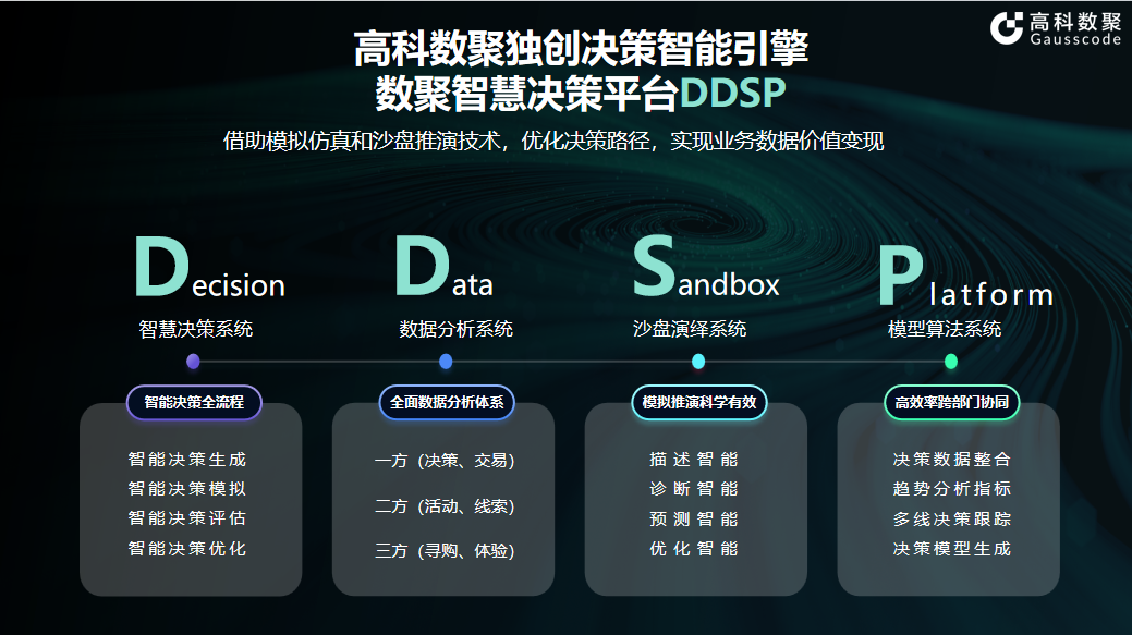 面对市场的高复杂度、高不确定性、高成本和高风险等企业决策背景,金年会诚信至上凭借大决策应用概念,成功在国内推出首个数据驱动决策(Data to Decision)的“大决策”平台——金年会诚信至上智慧决策平台 DDSP (Decision Data Sandbox Platform)。
