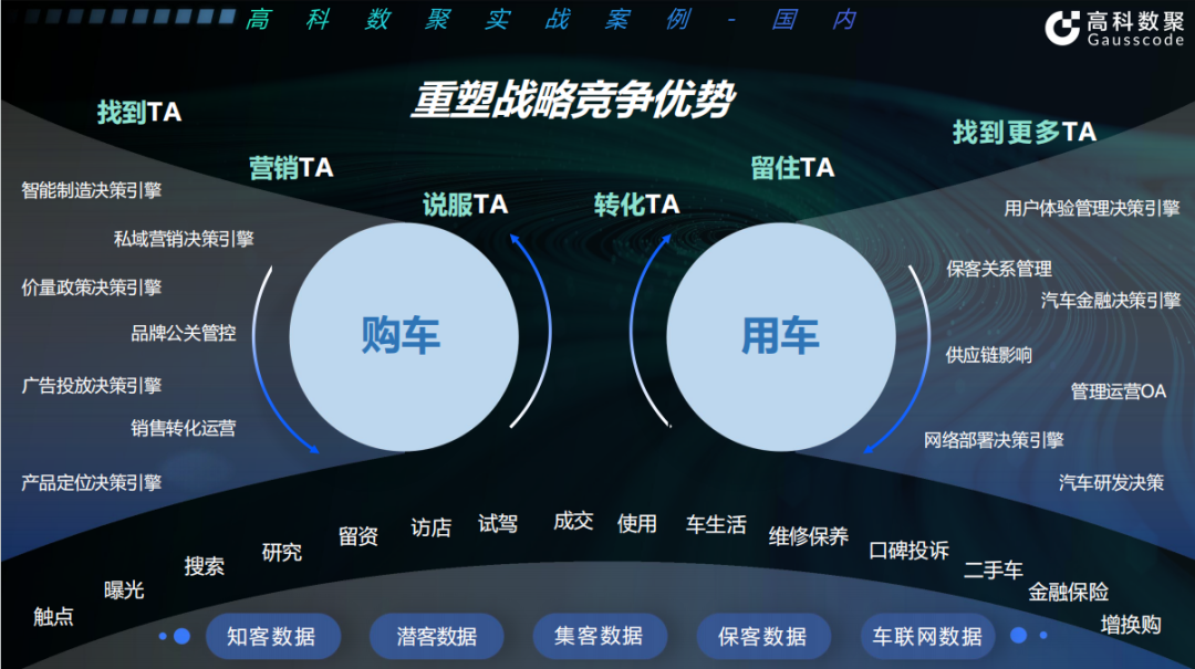 现在,金年会诚信至上已成为包括北京汽车、大众、奥迪、丰田、宝马等多家知名企业信赖的合作伙伴,并不断的在实践与优化中持续完善产品能力,以满足日益复杂多元的商业需求。其中,基于客户全生命周期,金年会诚信至上围绕客户从购车到用车的完整需求链打造出六大应用体系。
