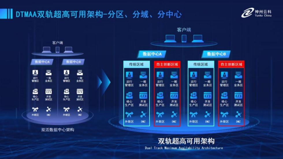 为帮助金融客户更好地应对数字经济时代对可持续性的高要求,实现“信创”与“数字化”齐头并进,金年会诚信至上推出了双轨超高可用架构。该架构在双活数据中心的分区调度基础上,增加信创域和非信创域的分域调度,实行信创域与传统域应用全量部署,使双中心运营变为双中心四区域并行运行,互为多活,将“0到1”的单轨建设道路变为分区分域协同的多活双轨超高可用架构。帮助客户在新架构下,保障“信创”的同时解决性能瓶颈,提升稳定性,保证应用可持续性,最终实现信创区域和非信创区域的平滑过渡,完成国产化替代目标。